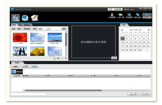独创时间轨技术,每个分区对应一条轨道,素材直接拖放入轨,直观便捷;各轨道可按日、周、月、年或万年历自由编排定期/定时/定长/定次节目播表,可调音量大小,节目素材切换时可添加底波表和背景效果。